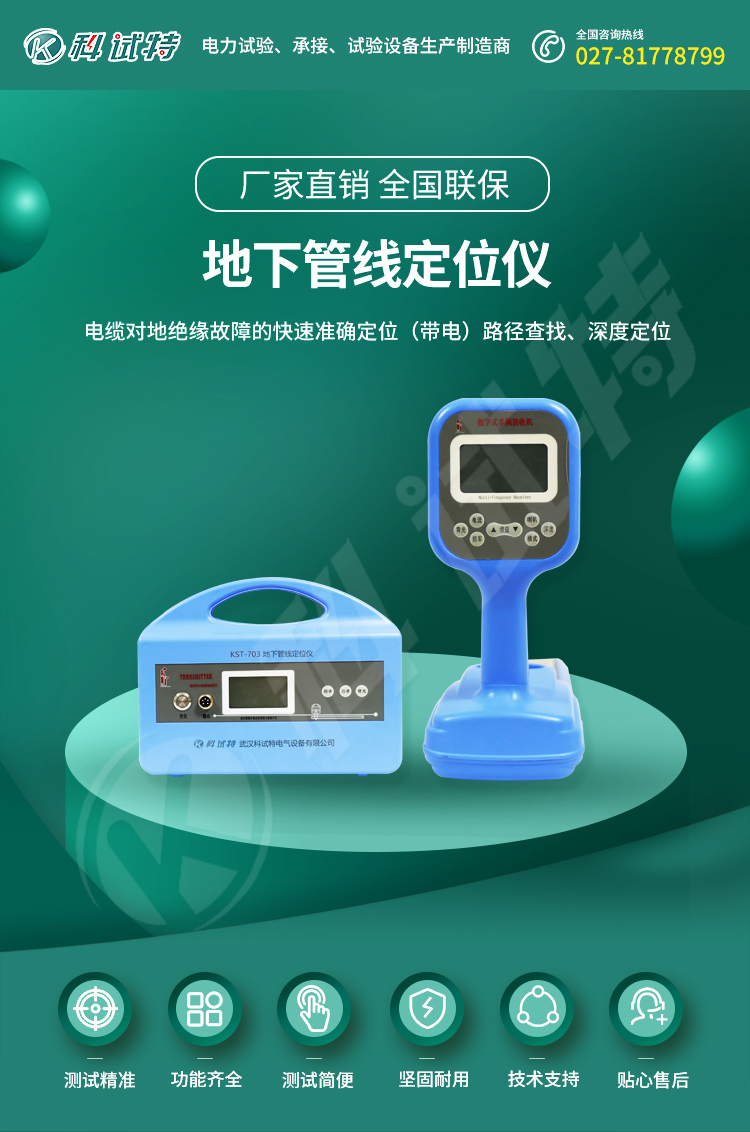 KST-703地下管线定位仪是以电磁感应法为基础加以通讯原理的应用设计而成。在使用上包含了更多人性化的设计,通过大屏液晶显示信号强弱,条栅、箭头及声音提示使得操作者很容易判断电缆地下位置及故障点。一人即可完成全部操作。
