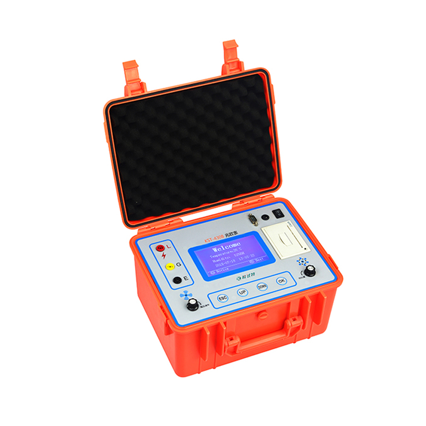 我公司生产的KST-430B数字兆欧表由中大规模集成电路组成。本表输出功率大,短路电流值高,输出电压等级多(有四个电压等级)。工作原理为由机内电池作为电源经DC/DC变换产生的直流高压由E极出经被测试品到达L极,从而产生一个从E到L极的电流,经过I/V变换经除法器完成运算直接将被测的绝缘电阻值由LCD显示出来。