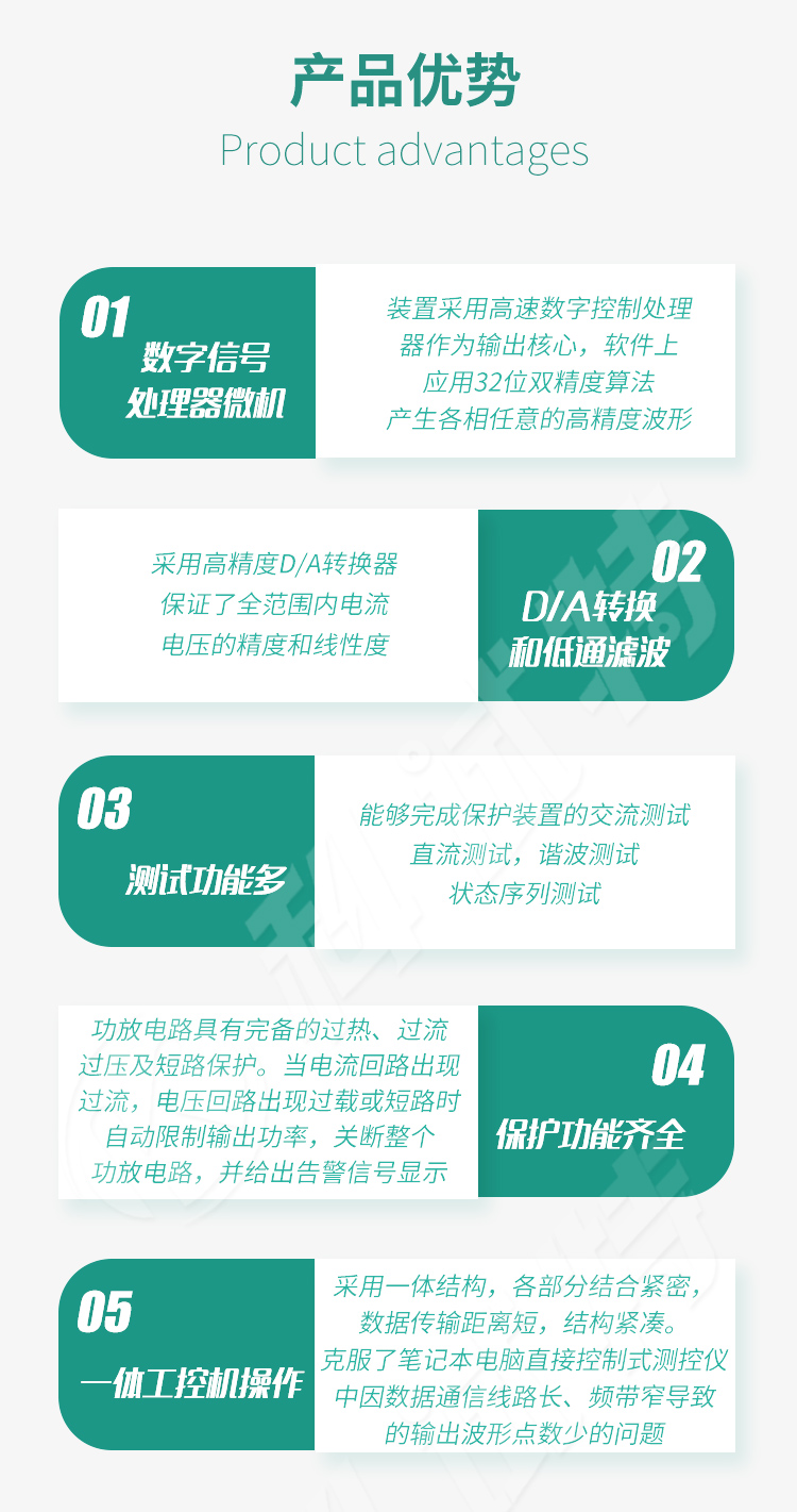 4、输出部分采用DSP控制,运算速度快,实时数字信号处理能力强,传输频带宽,控制高分辨率D/A转换。输出波形精度高,失真小线性好。采用了大量先进技术和精密元器件材料,并进行了专业化的结构设计,因而装置体积小、重量轻、功能全、携带方便,开机即可工作,流动试验非常方便;