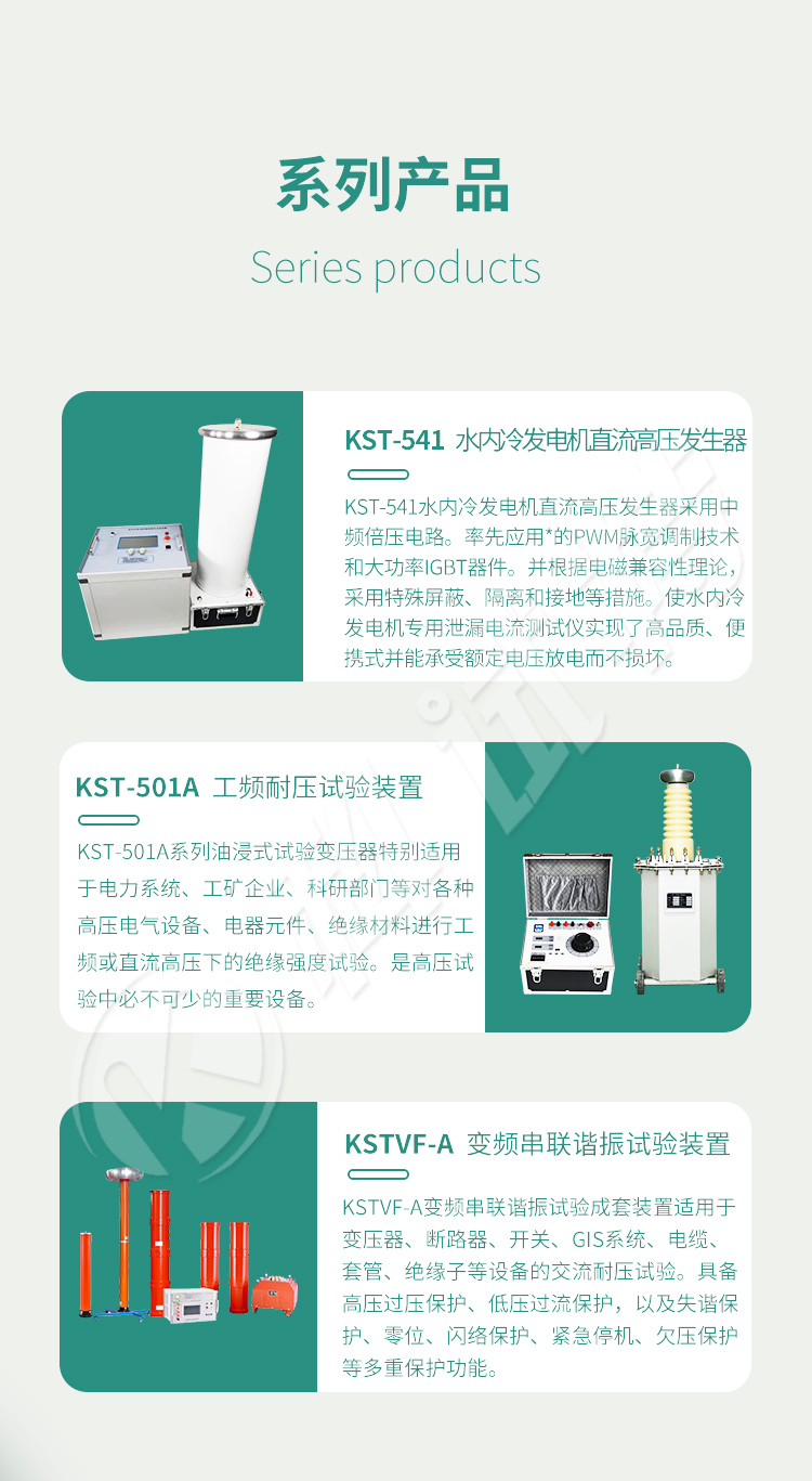 KST-540系列直流高压发生器是根据新的中国电力行业标准DL/T848.1-2004《直流高压发生器通用技术条件》设计制造的新一代便携式直流高压试验器。主要适用于电力部门、厂矿企业动力部门、科研单位、铁路、化工、发电厂等对氧化锌避雷器、磁吹避雷器、电力电缆、发电机、变压器、开关等高压电气设备进行直流耐压试验。KST-540系列直流高压发生器采用中频倍压电路,PWM中频脉宽调制技术,使电压稳定度大幅度提高。根据电磁兼容性理论,采用特殊屏蔽、隔离和接地等措施,使直流高压发生器在额定电压下放电而不损坏仪器。