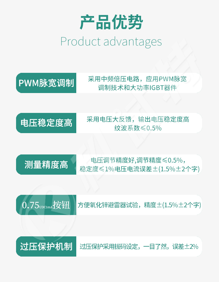 6、0.75UDC1mA功能按钮,方便氧化锌避雷器试验,精度±(1.5%±2个字)。