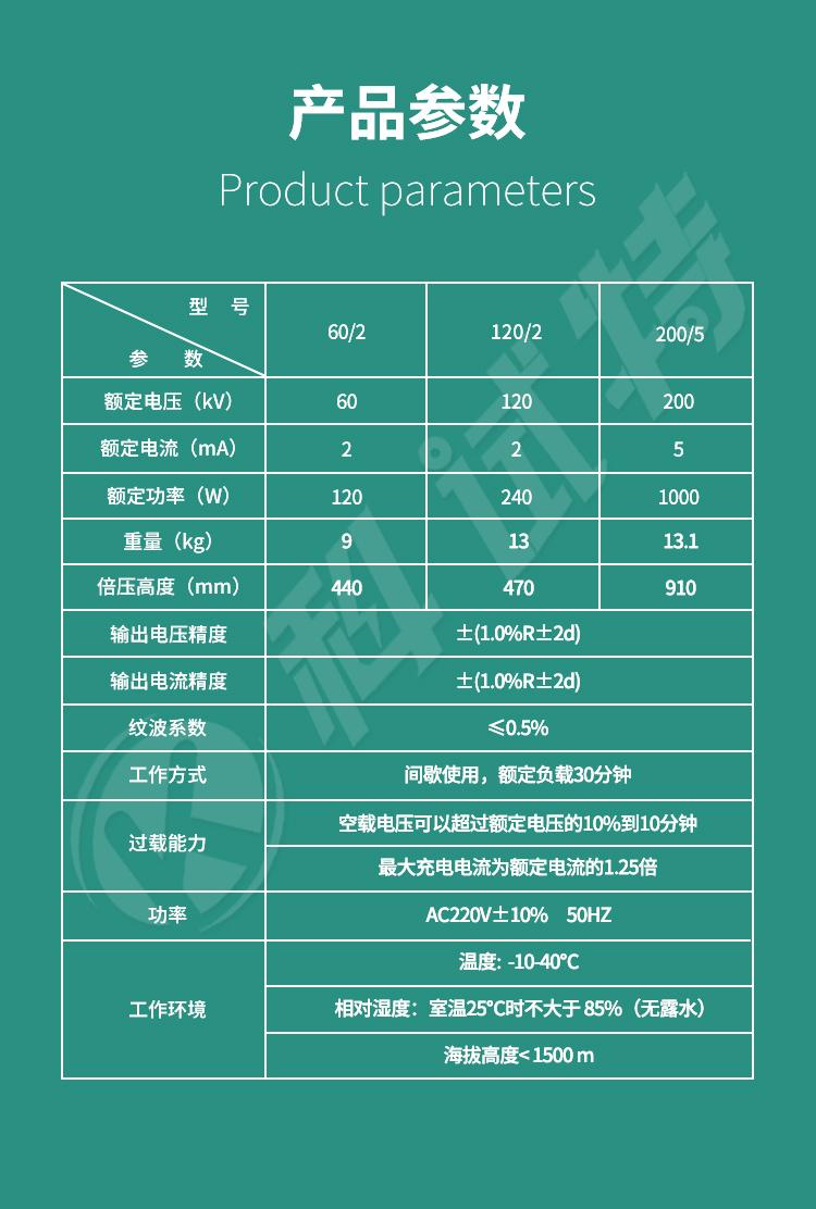 8、倍压采用新型材料,轻巧、坚固。外表涂特种绝缘材料,电气性能好,防潮能力强。