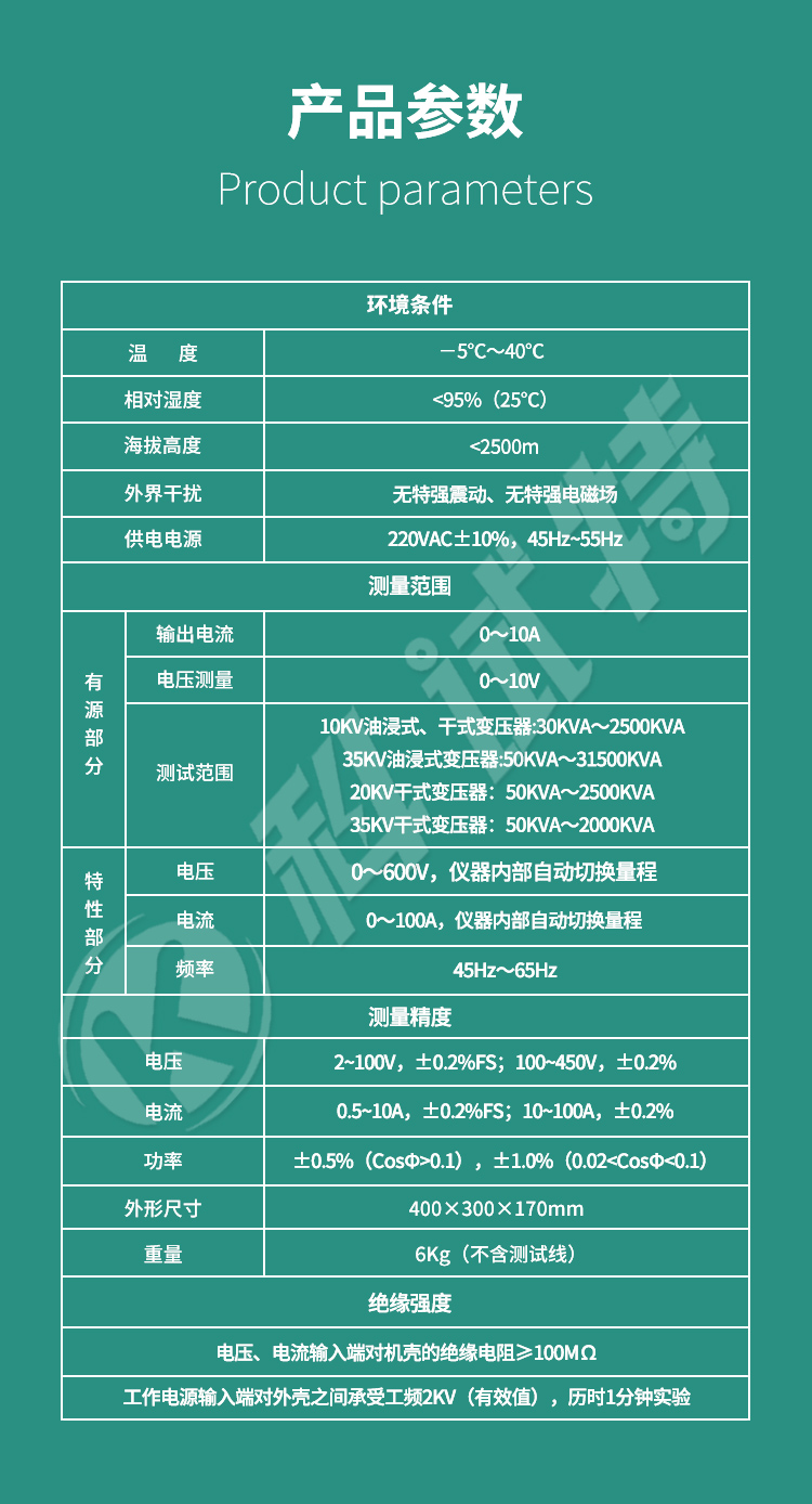 5、单机可以完成1000KVA以下的配电变压器全电流下的负载实验的测量;在三分之一额定电流下可完成3150KVA以下的配电变压器的负载试验的测量(在三分之一的额定电流下,仪器可换算到额定电流下的负载损耗参数)。
