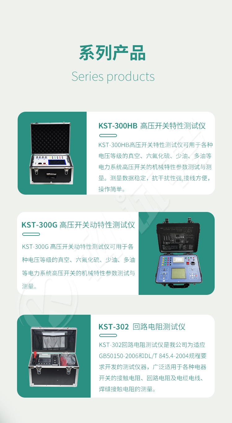 随着社会的发展,人们对用电的安全可靠性要求越来越高,高压断路器在电力系统中担负着控制和保护的双重任务,其性能的优劣直接关系到电力系统的安全运行。机械特性参数是判断断路器性能的重要参数之一。KST-300B高压开关动特性测试仪是依据*的《高压交流断路器》GB1984-2003为设计蓝本,参照中华人民共和国电力行业标准《高电压测试设备通用技术条件》第3部分,DL/T846.3-2004为设计依据,为进行各类断路器动态分析提供了方便,能够准确地测量出各种电压等级的少油、多油、真空、六氟化硫等高压断路器的机械动特性参数。高压断路器在电力系统中担负着控制和保护的双重任务,其性能的优劣直接关系到电力系统的安全运行。机械特性参数是判断断路器性能的重要参数之一。