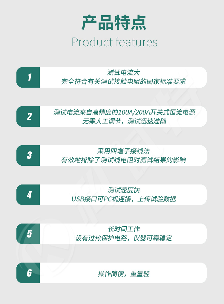 1、测试电流大,完全符合有关测试接触电阻的国家标准要求。