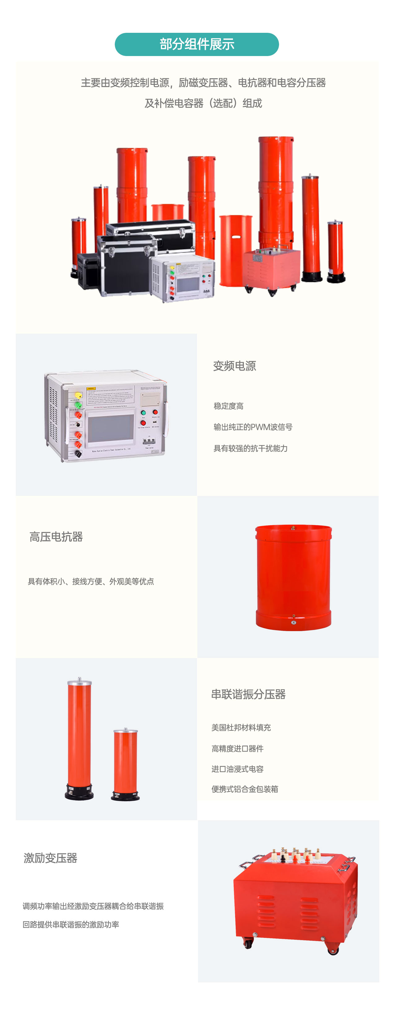 | 产品 型号 | 变频 电源 | 谐振 电抗器 | 激励 变压器 | 分压器 | 适用 范围 |
